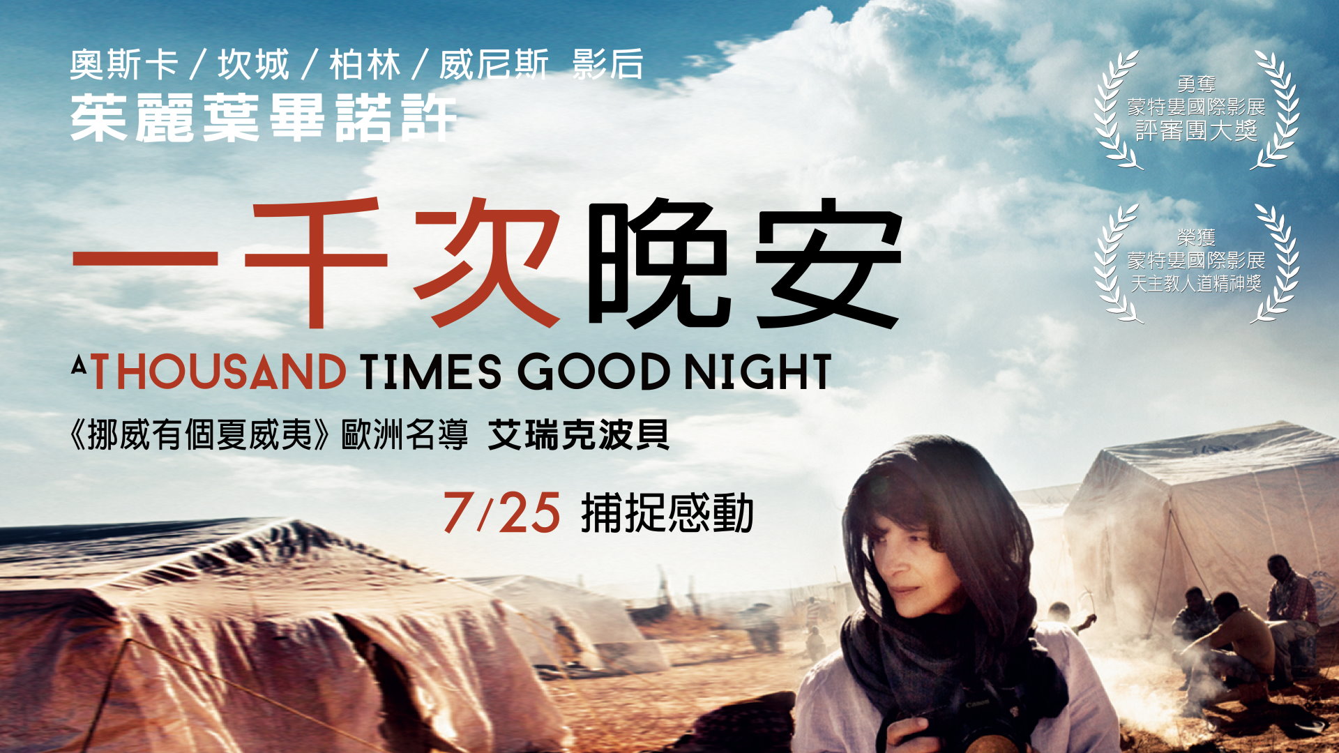 曾獲奧斯卡獎及坎城、柏林與威尼斯影后大獎的法國女星茱麗葉畢諾許(Juliette Binoche),在新片《一千次晚安》(A Thousand Times Good Night)飾演一名戰地攝影師蕾貝卡。片中除展現人們難得一見的戰地風光外,茱麗葉畢諾許更將女記者不懼生死的堅毅個性,詮釋得令人感佩,更把女性職場與家庭難以兩全的掙扎,演繹得絲絲入扣,不僅獲得美國【綜藝報】與【好萊塢報導】的雙雙好評,電影更一舉奪下蒙特婁國際影展「評審團大獎」及「天主教人道精神獎」雙料大獎。